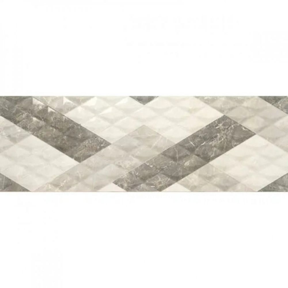 Bela pasta, rektificirana, za unutrašnje oblaganje zidova. Keramička pločica, bež osnova sa svetlije bež šarama, imitacija mermera, ispupčeni romboidi u nijansama bež i braon boje. Zidna pločica za kuhinju, kupatilo ili kao dekor zida u prostoru. Pločica ima sjajnu površinu, reljefna, reljef je imitacija peščanih dina i 3D. Španska pločica.