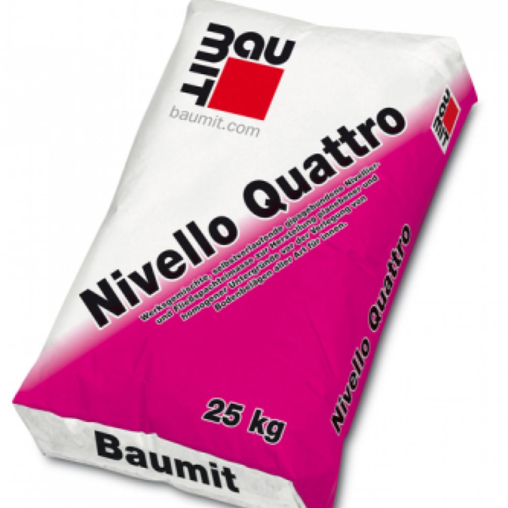 Baumit Nivello Quattro 25kg je samoizravnavajuća brzovezujuća masa na bazi kalcijum sulfata, koja se koristi za postizanje ravnih i homogenih podloga pre nanošenja završnih obloga. Ova masa je pogodna za renoviranje i novogradnju u debljini sloja od 1 – 20 mm, a može se koristiti i za podno grejanje. Nivello Quattro savršeno niveliše podlogu, bez skupljanja, a potrebno vreme za aplikaciju je oko 30 minuta. Masa je prohodna nakon 2 do 3 sata, a pripremljena je za debljine do 3mm nakon 24 sata, dok za veće debljine treba sačekati 1 dan po mm debljine.Potrošnja iznosi oko 1.5 kg/m²/mm.