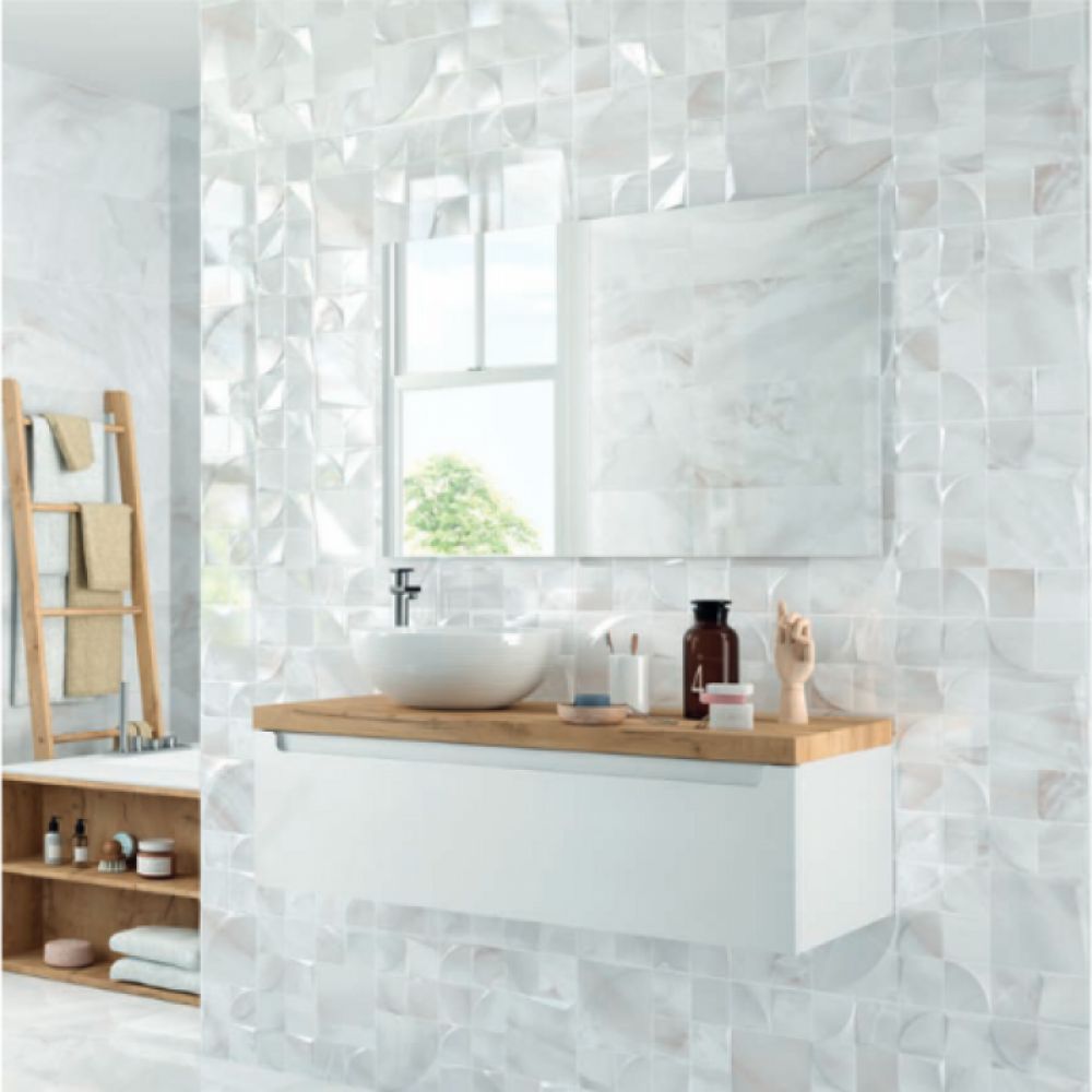 Pločice Diva MU, mozaik koji svojim prelamanjem zbog 3D površine i svetlom bojom razigrava prostor, idealna je za akcentovanje dela prostora. Bela pasta visoki sjaj, retificirana, 3D mozaik.