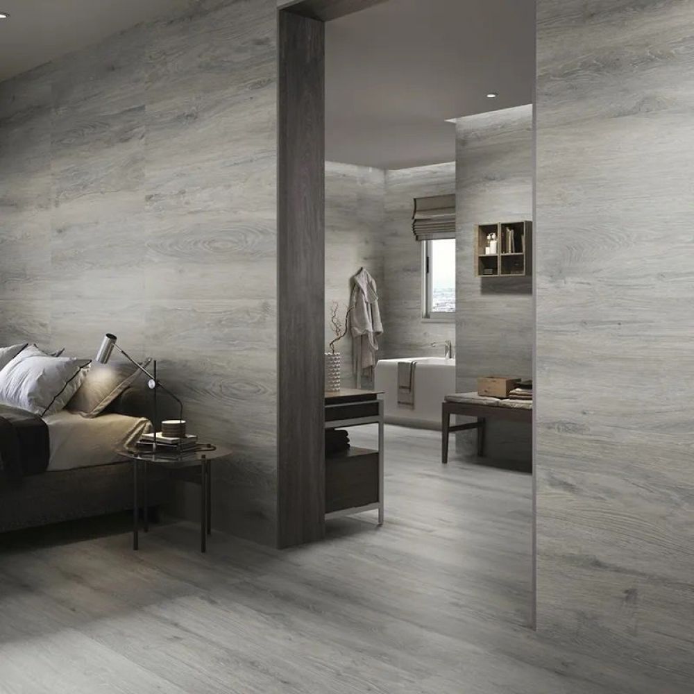 Podna pločica, jaka, ravna, mat, imitacija drveta, tamno sive boje. Pločica je otporna na mraz, Španska pločica.