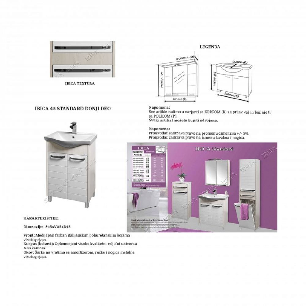 Proizvođač: Lux Ceramica Serija Ibica Front: Medijapan farban italijanskim poliuretanskim bojama visokog sjaja. Korpus (bokovi): Oplemenjeni visoko kvalitetni reljefni univer sa ABS kantom. Okov: Šarke na vratima sa amortizerom, ručke i nogice metalne visokog sjaja.