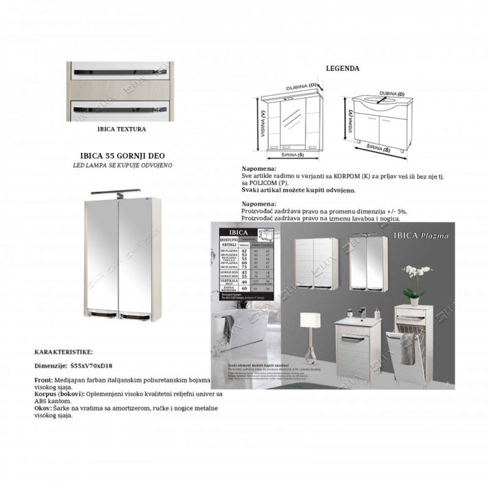 Proizvođač: Lux Ceramica Serija Ibica Front: Medijapan farban italijanskim poliuretanskim bojama visokog sjaja. Korpus (bokovi): Oplemenjeni visoko kvalitetni reljefni univer sa ABS kantom. Okov: Šarke na vratima sa amortizerom, ručke i nogice metalne visokog sjaja.
