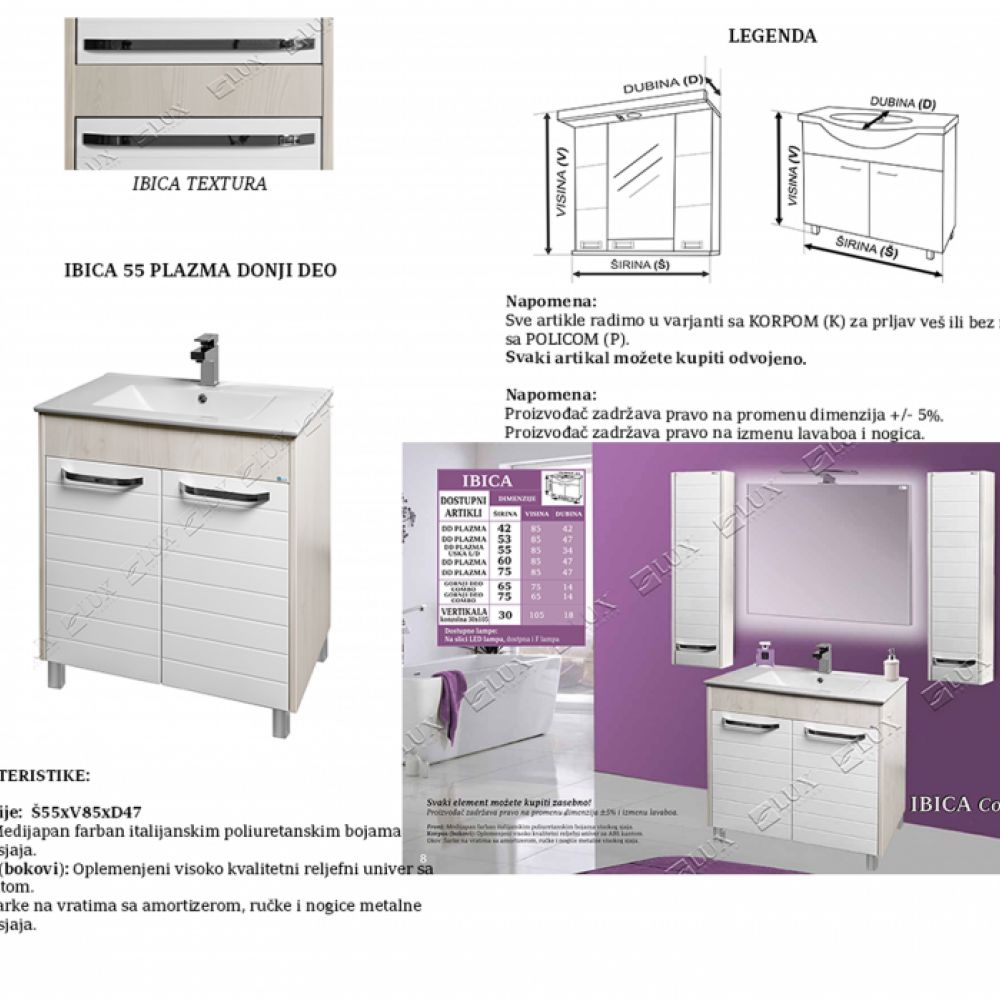Proizvođač: Lux Ceramica Serija Ibica Front: Medijapan farban italijanskim poliuretanskim bojama visokog sjaja. Korpus (bokovi): Oplemenjeni visoko kvalitetni reljefni univer sa ABS kantom. Okov: Šarke na vratima sa amortizerom, ručke i nogice metalne visokog sjaja.