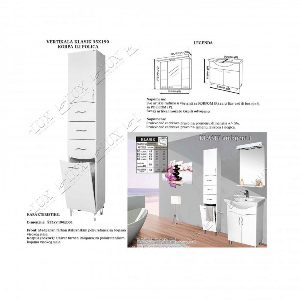 FRONT: MEDIJAPAN FARBAN ITALIJANSKIM POLIURETANSKIM BOJAMA VISOKOG SJAJA. KORPUS (BOKOVI): UNIVER FARBAN ITALIJANSKIM POLIURETANSKIM BOJAMA VISOKOG SJAJA. PROIZVOĐAČ: LUX CERAMICA, MLADENOVAC