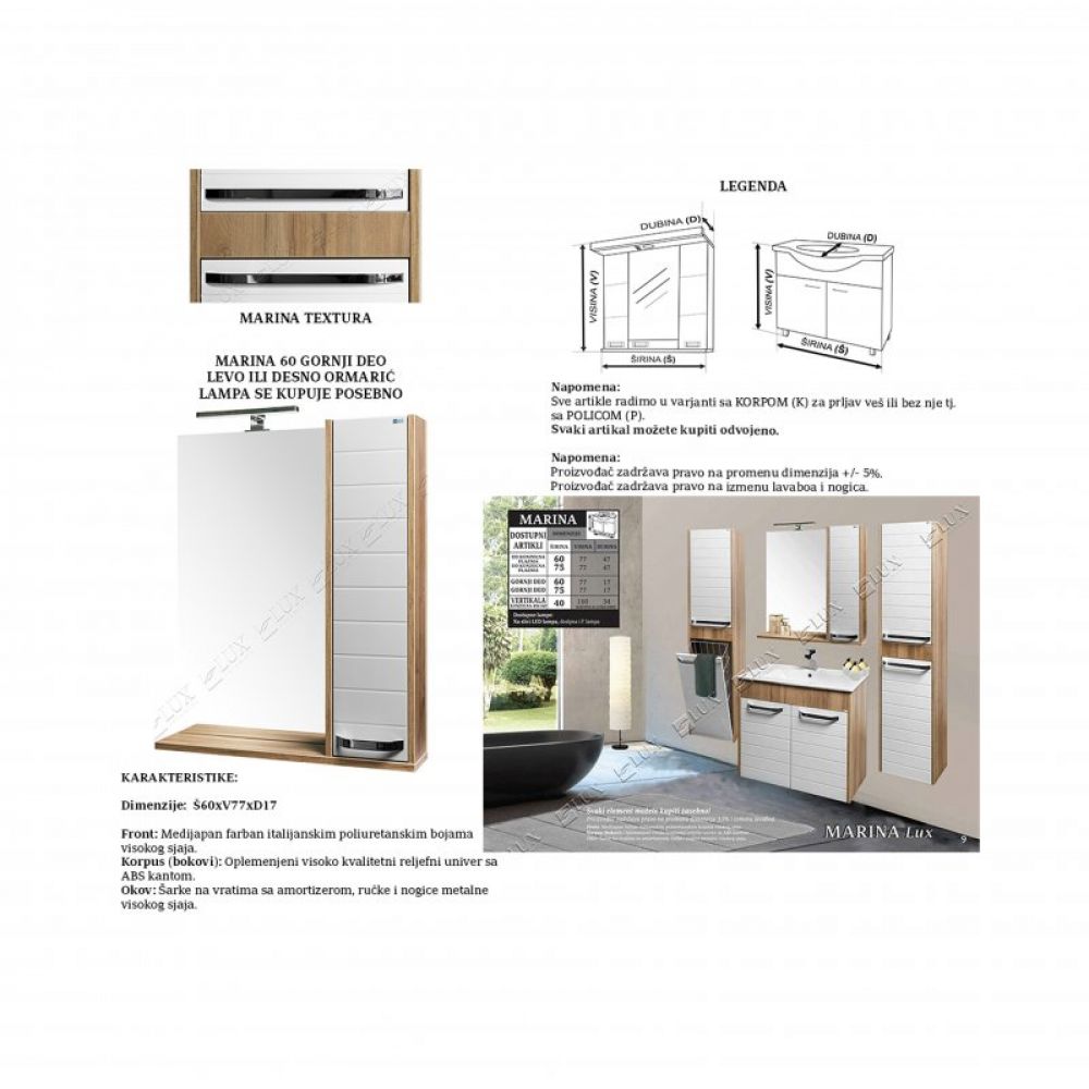 Proizvođač: Lux Ceramica Serija Marina Front: Medijapan farban italijanskim poliuretanskim bojama visokog sjaja. Korpus (bokovi): Oplemenjeni visoko kvalitetni reljefni univer sa ABS kantom. Okov: Šarke na vratima sa amortizerom, ručke i nogice metalne visokog sjaja.