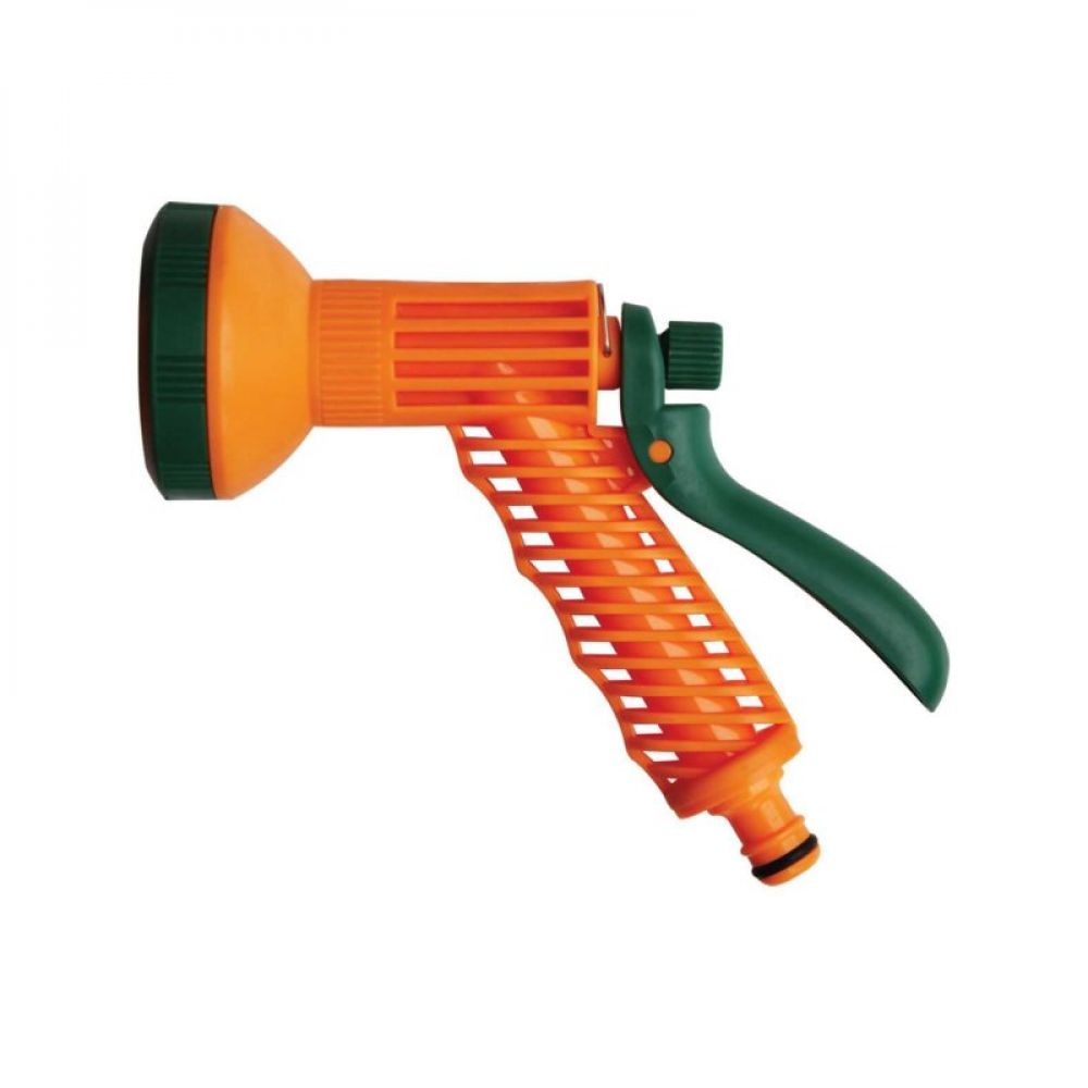Pištolj za zalivanje sa standardnim priključkom od 1/2". Ima 6 mlazeva sa stop funkcijom i mogućnost regulacije protoka vode. Izrađen je od polimera i gume i stoga je dugotrajan.