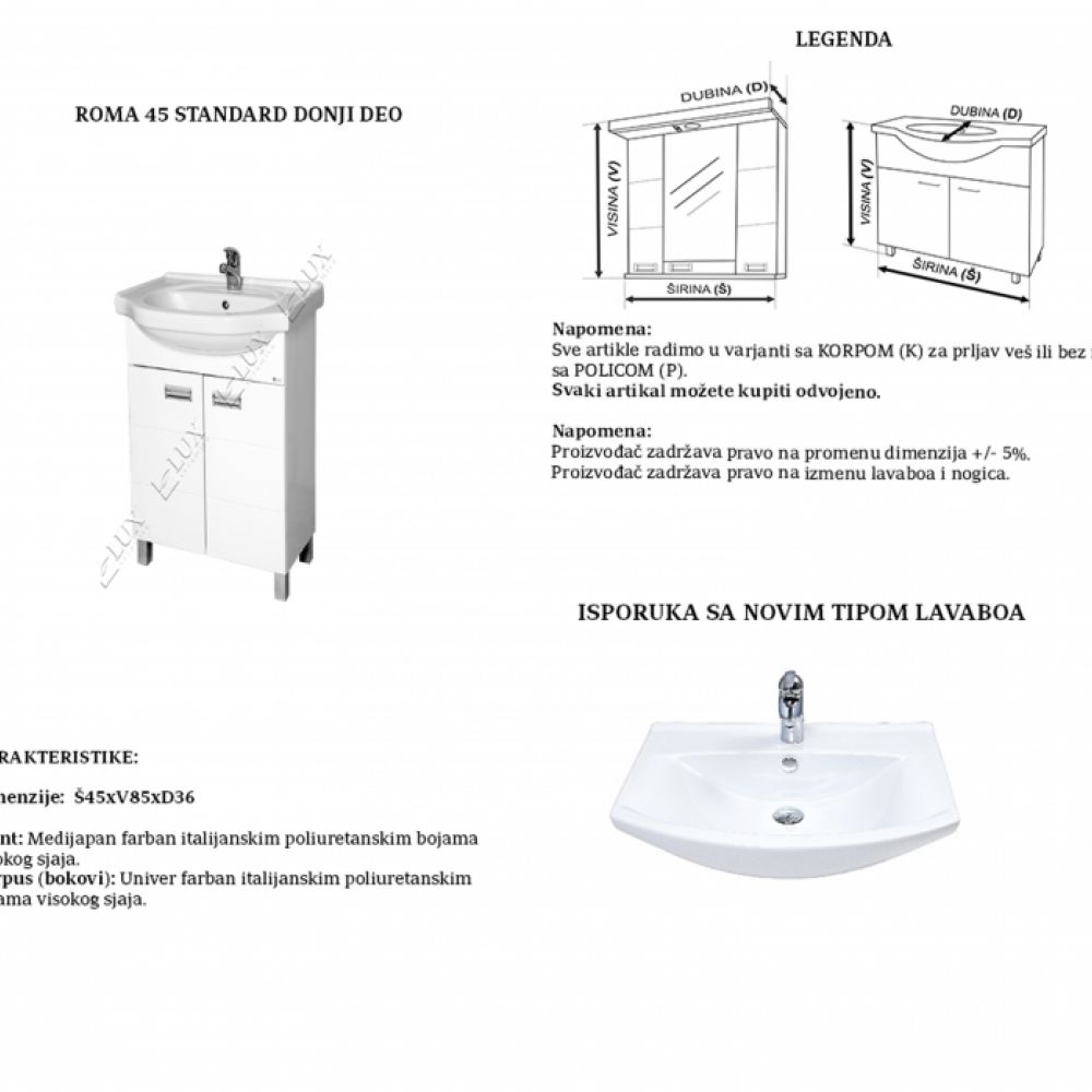 Front: Medijapan farban italijanskim poliuretanskim bojama visokog sjaja. Korpus (bokovi): Univer farban italijanskim poliuretanskim bojama visokog sjaja.