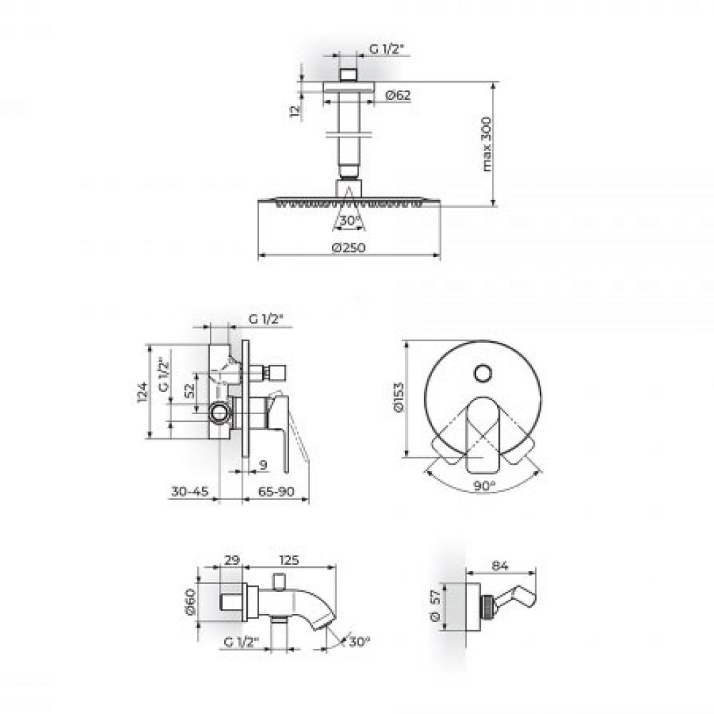 S2 Gold 231703G uzidna baterija sa izlivom, zidnim tušem D.250mm i ručnim tušem