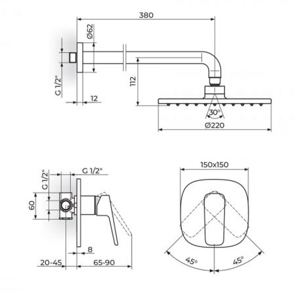 TEHNIČKE KARAKTERISTIKE Jednoručna baterija Uzidna montaža Masivna kontrukcija Klasa protoka 9 lit/min Keramički mešač KEROX® 35 HWS - PKM35A Tuš ruža 250x250 mm sa zglobom - PTRUSP11 Klasa bučnosti II