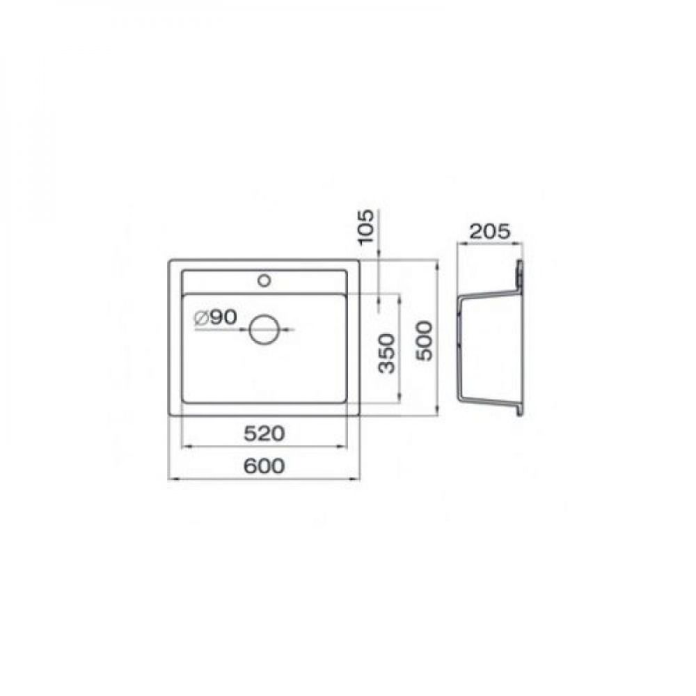 Dimenzije: 600x500 mm Dubina korita: 195 mm Mera ormarića: 600 mm Otvor sifona: Ø90 mm Dodatak uz sudoperu: sifon Ø90 mm