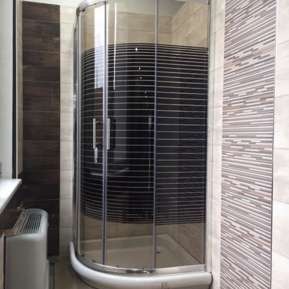 Dimezije: 90x90x190, R 90, radijus: 550 mm Vrsta stakla, debljina: braon sa crnim linijama, 5 mm Visina kabine: 190 cm Vrsta profila Aluminijumski Boja profila: Srebrna Kompenzacioni profili: Da Tockici: Gornji dupli, donji jednodelni Ruckice: Aluminijumske, hromirane Dihtovanje: Magnetna traka + silikonske lajsne